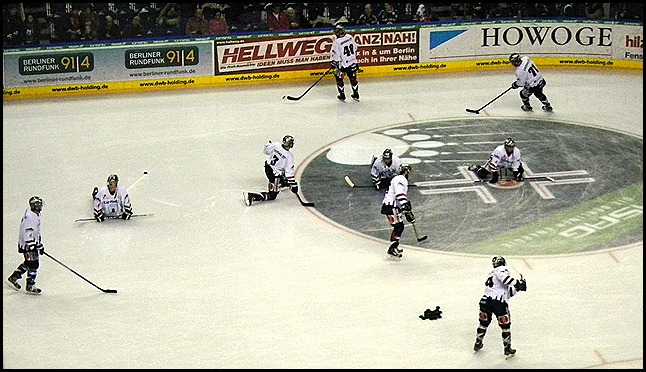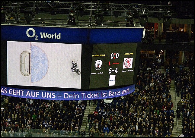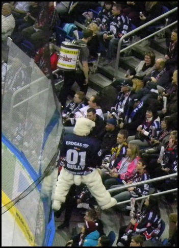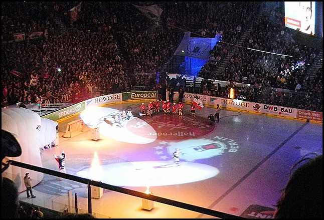 Was kann ich noch erzählen? Also ausgegangen ist es schließlich 5 – 4, nebenbei bemerkt ;) Und ich suche schon nach Möglichkeiten, weitere Spiele anzusehen :D Da hat wohl jemand Feuer gefangen, hihi. Wo wir gerade bei “Feuer” sind: Die Anfangsshow mit dem kleinen Feuerwerk in der O2 World war auch sehr cool. Ich war zwar durch meine Kollegen vorgewarnt, aber trotzdem bin ich bei dem ersten Knall etwas erschrocken :D Und dann gab es noch Flammen bei jedem Eisbären, der feierlichst durch den aufgeblasenen Eisbär-Kopf aufs Eis gekommen ist.