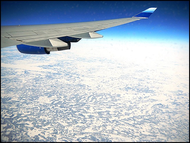 Der Abschied war natürlich eher unschön. Auch dann im Flugzeug das Ausschalten meines Blackys – ist schon komisch, wenn einem durch so ein Gerät bewusst wird, dass man wirklich von zu Hause weg geht! Meine Trauer wurde aber von dem Schock über das Flugzeug etwas unterbrochen – ich hatte noch NIE auf einem Langstreckenflug keinen eigenen Bildschirm. Und damit auch keine Macht über das Programm. Fand ich echt blöd^^ Den ersten Film (Skyfall) habe ich angefangen, aber man wird ja doch ständig unterbrochen, wenn Essen oder Einreisepapiere oder sowas ausgeteilt wird. Naja, habe ihn schließlich abgebrochen und mich mit meinem mp3-Player und meinem ebook-Reader versorgt. Und damit, immer mal wieder aus dem Fenster zu sehen. Wisst ihr… wer denkt, dass die Erde hässlich ist, der soll sie mal von oben ansehen. Ich war heute immer und immer wieder sehr begeistert! Leider weiß ich bei den meisten Bildern, die ich gemacht habe, nicht, wo das ca. ist. Hängt auch damit zusammen, dass ich nicht permanent die Flugroute sehen konnte, weil andere Filme wie Life of Pi gezeigt wurden. Blöd.