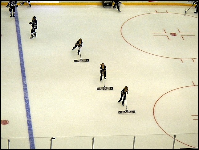 | Immer wieder waren während der Drittel kurze Pausen, in denen das Eis etwas gesäubert wurde. Von schönen Blondinen ;) |