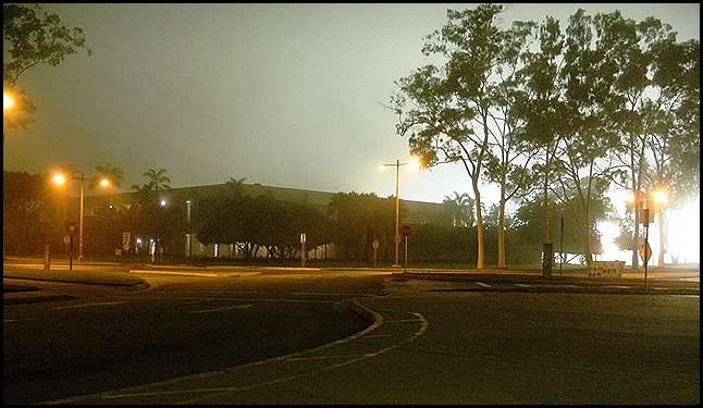 Es war tagsüber wieder schön sonnig, ist aber Abends neblig geworden. Stevi sagt, dass das ist, weil der Campus so nah am Meer ist. Sah aus, als wären Wolken plötzlich auf 1m Höhe gefallen, oder als wäre ein Sandsturm unterwegs. Ich habe ein Foto gemacht.