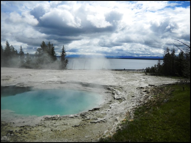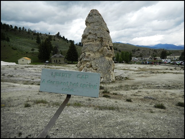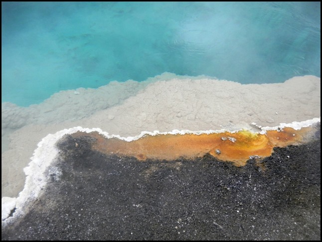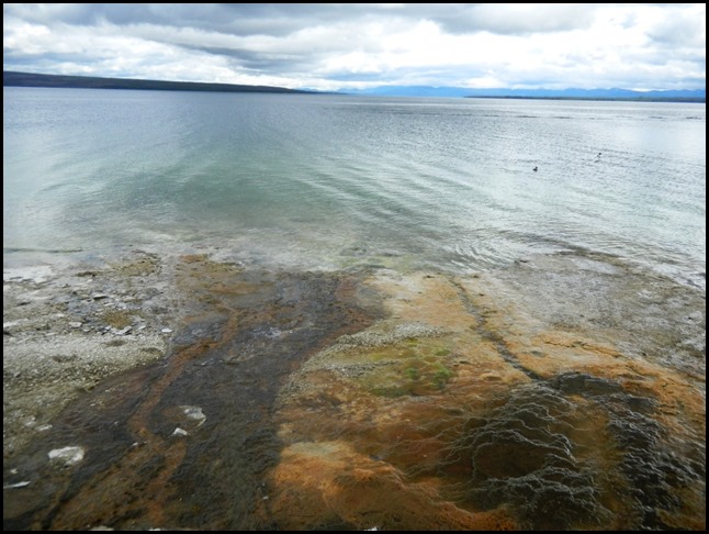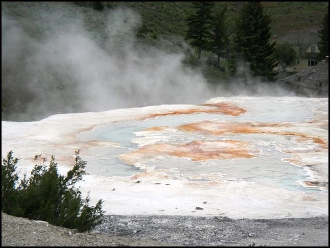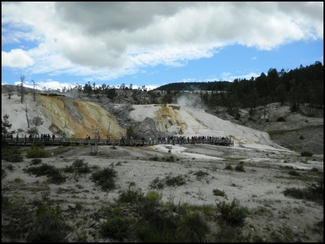 Wir sind jetzt im Yellowstone NP angekommen und haben schon die ersten 45min Auslauf hinter uns. Der Stop war in der Nähe des Nord-Eingangs, beim Roosevelt-Gate. Iris wollte Fotos machen, aber da hat es gerade geregnet. 5min später war der Regen weg und wir waren bei unserem Halt an den Mammoth Hot Springs. Das sind heiße Quellen (was, wirklich??), die schön dampfen und Ebene für Ebene das Wasser den Berg wie bei Reis-Terrassenfeldern hinunterlaufen lassen. Es roch auch schön schwefelig. Mir hat das gut gefallen. Durch Bakterien und lauter solche Sachen ist der Boden wunderbar gefärbt! Die Damen im Bus hinter uns waren von Iris und mir ganz begeistert, weil wir nicht nur unten waren, sondern auch oben. Dann konnte ich ihnen kurz Bilder zeigen und sie waren ganz begeistert, was wir gesehen haben, hihi.