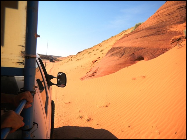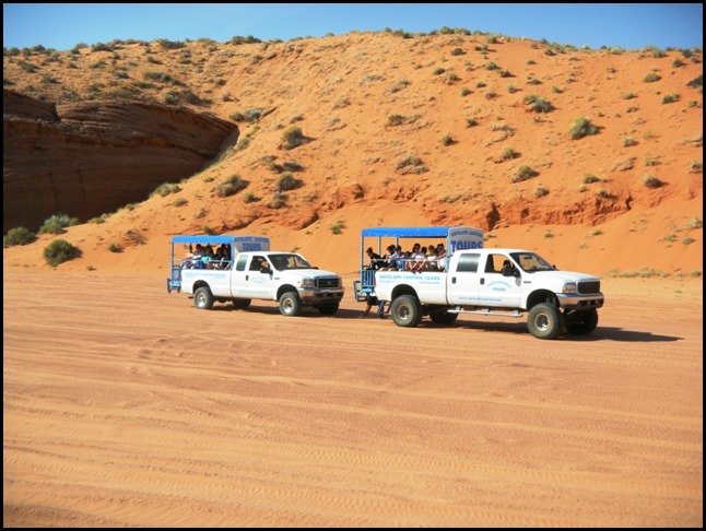 Nach einem schönen kleinen Frühstück (Erdbeerjoghurt und ein komisches kleines Gebäckteil) sind wir los zu den "Jeeps", die uns in den Antelope Canyon gefahren haben. Wir wurden dabei ziemlich durchgeschüttelt, weil wir schon nach kurzer Zeit die Straßen verlassen haben und über Sand gefahren sind. Die Landschaft wurde immer beeindruckender und hat meine ohnehin schon äußerst große Vorfreude angenehm verstärkt.